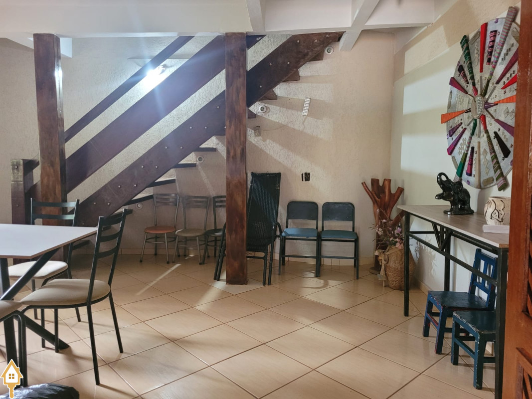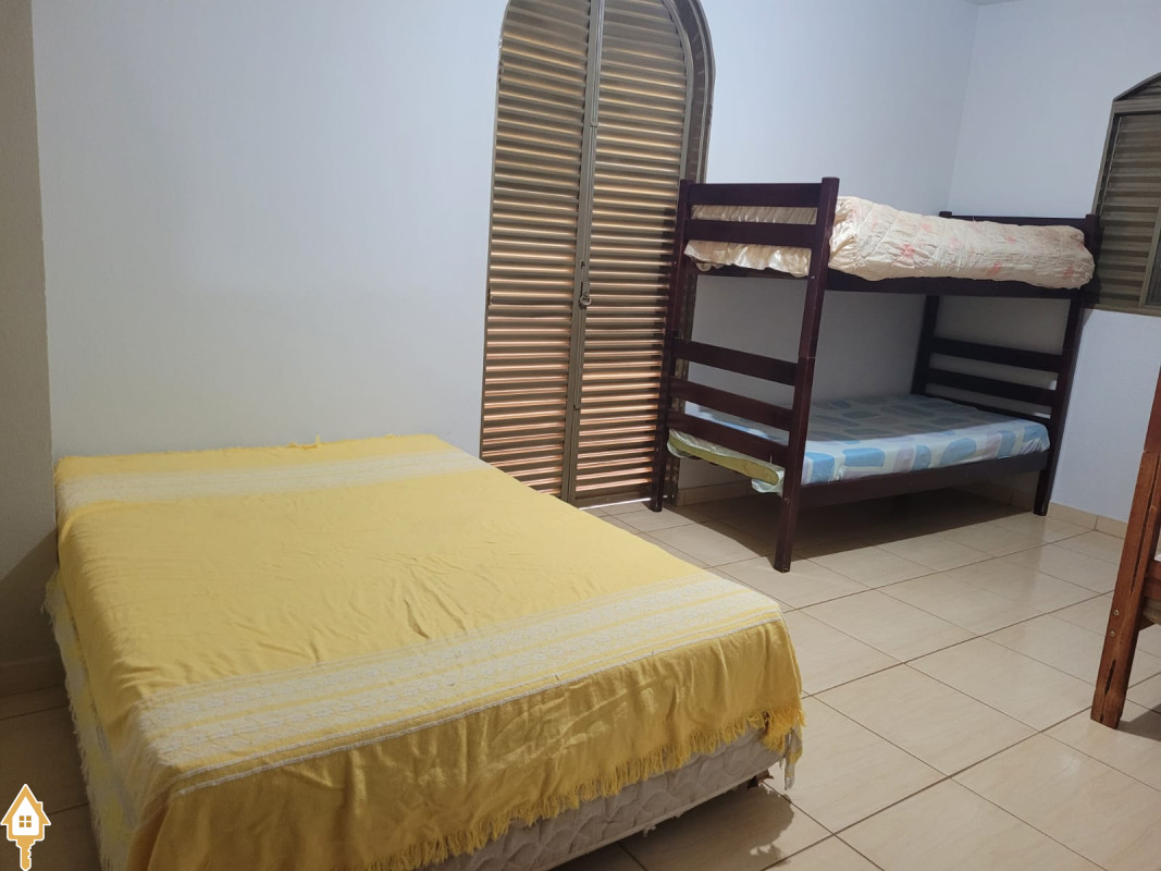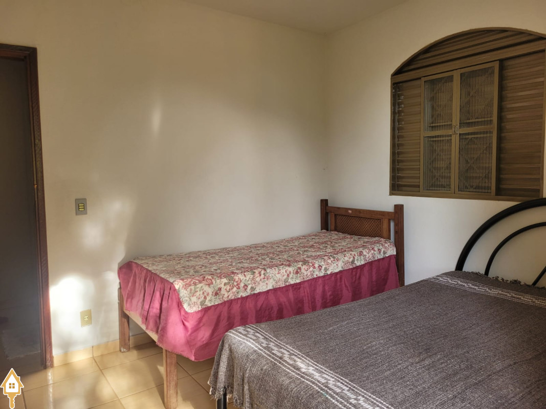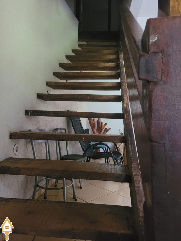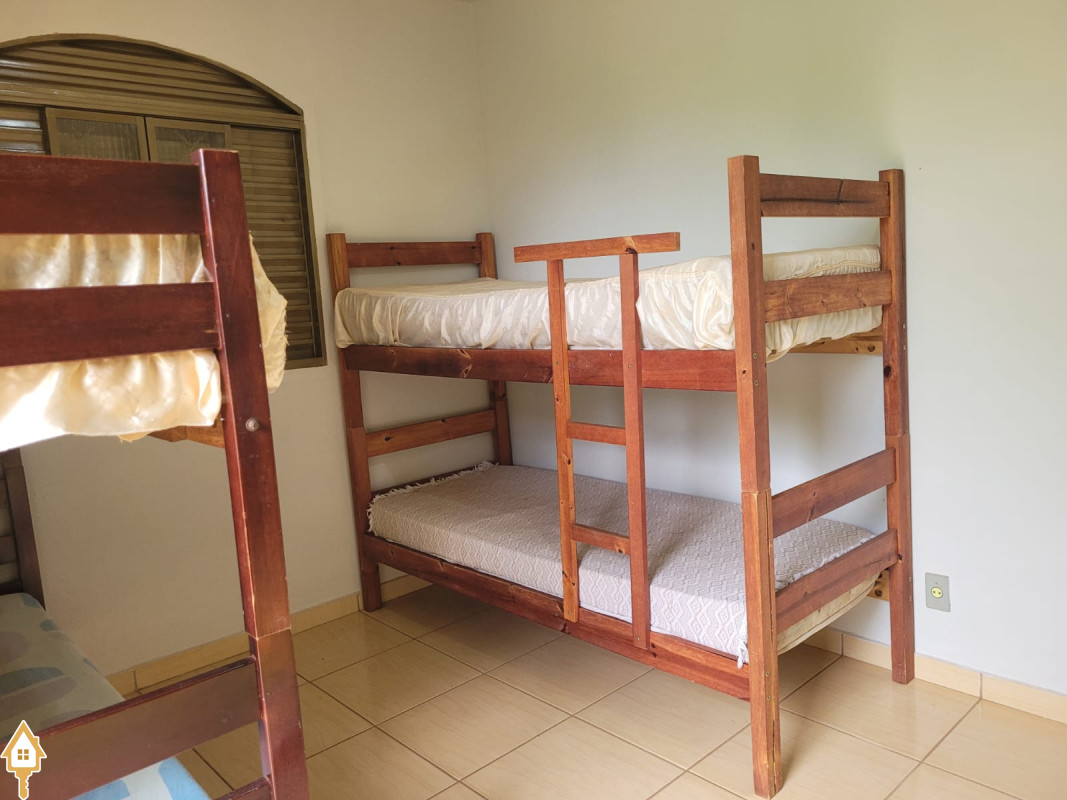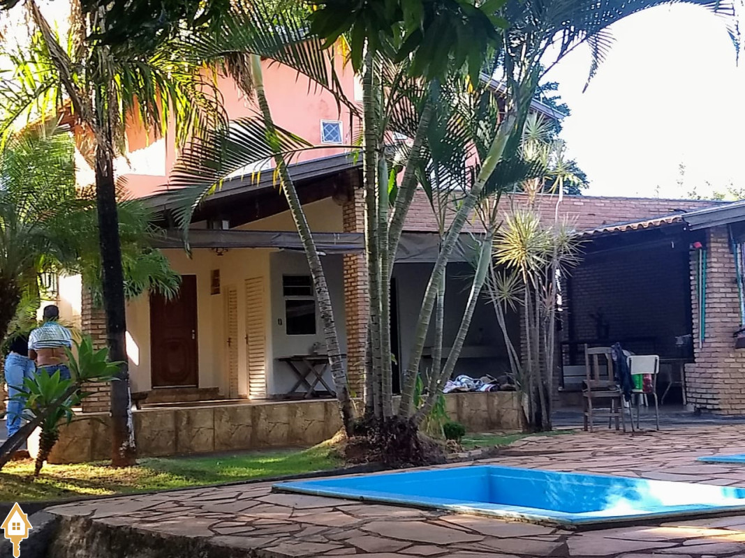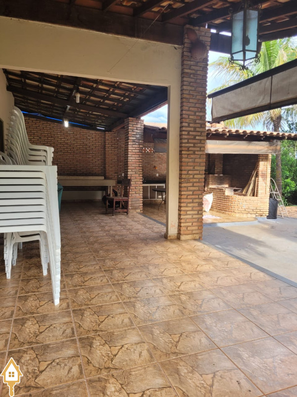 possui sobrado com 3 quartos. (2 em cima- ambos c/ sacada e 1 banheiro, 1quarto embaixo c/ um banheiro pequeno). sala, cozinha, varanda em L com dois banheiro, quiosque com fogão a lenha e churrasqueira. Bancada com pia. Uma área verde ampla c/ piscina adulto, piscina infantil,