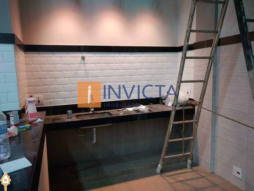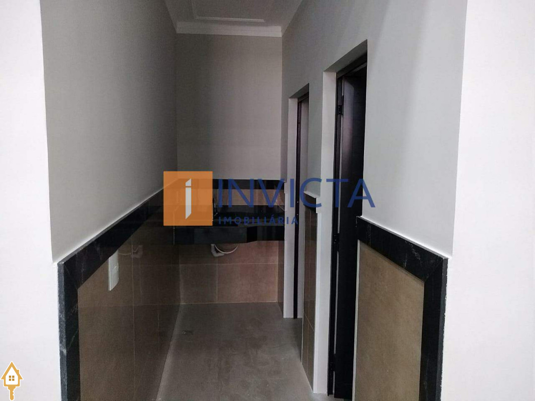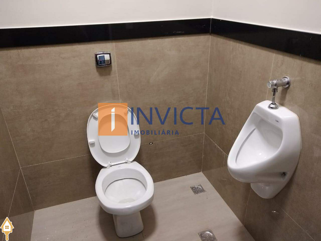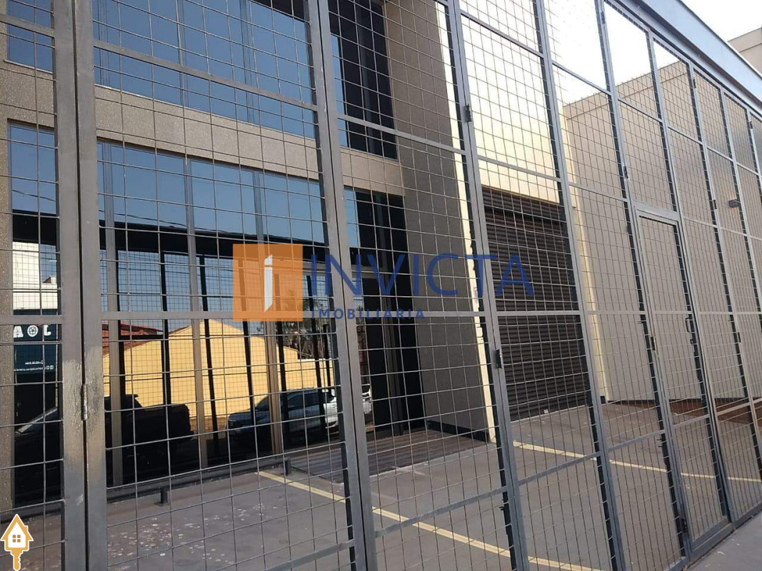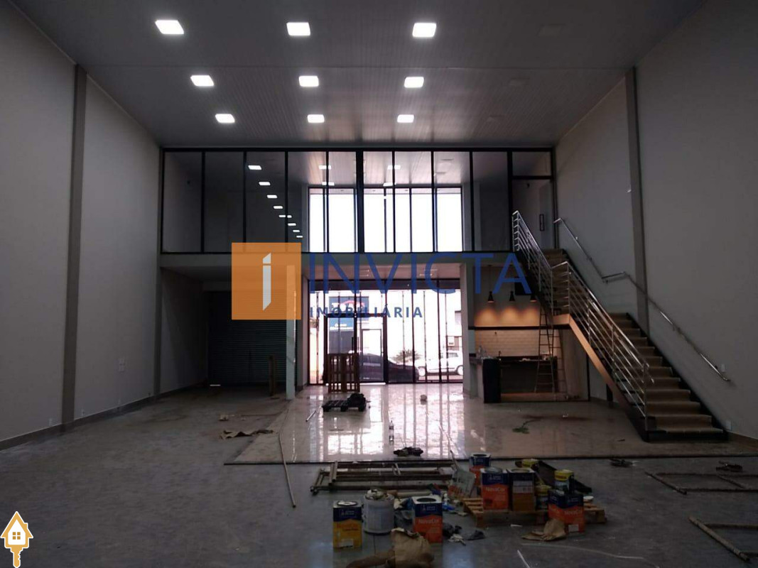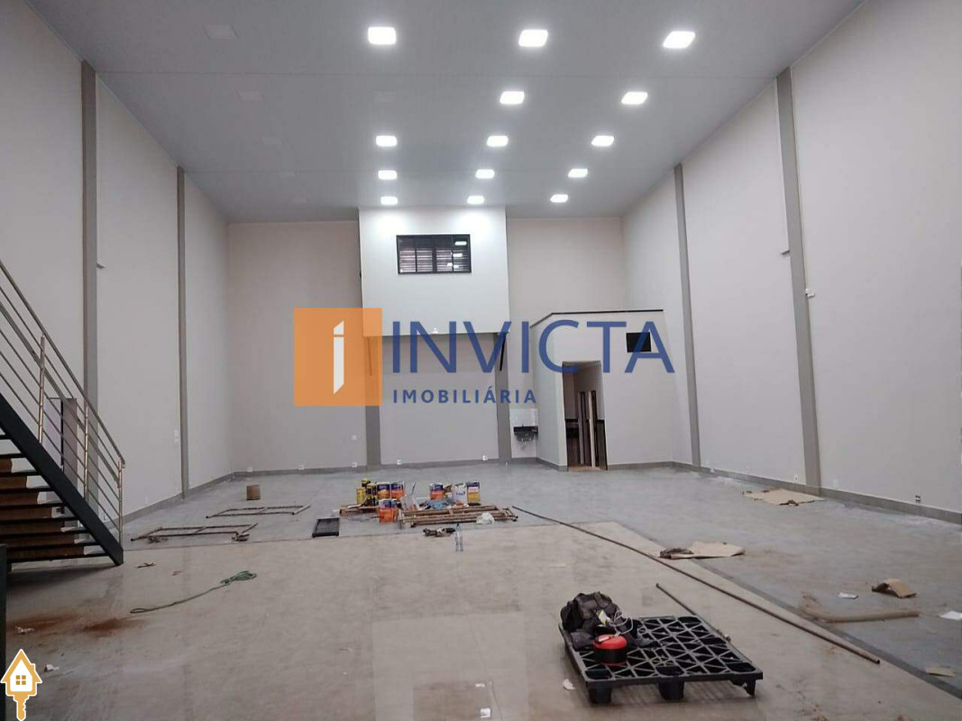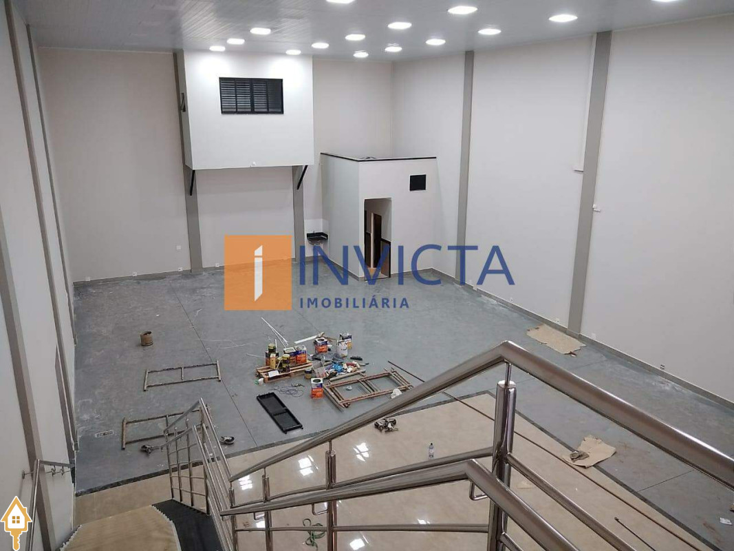 Galpão comercial de 352,7 m², com infraestrutura completa: amplo salão de 18x12 com pé direito de 6 metros, equipado com ar condicionado e forro, além de uma recepção com 2 banheiros adaptados para acessibilidade, copa, cozinha, DML, mais 2 banheiros internos e um mezanino, estacionamento frontal