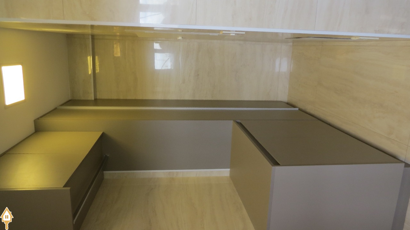 Varanda gourmet com bancada personalizada e armários planejados (na pia e superiores)