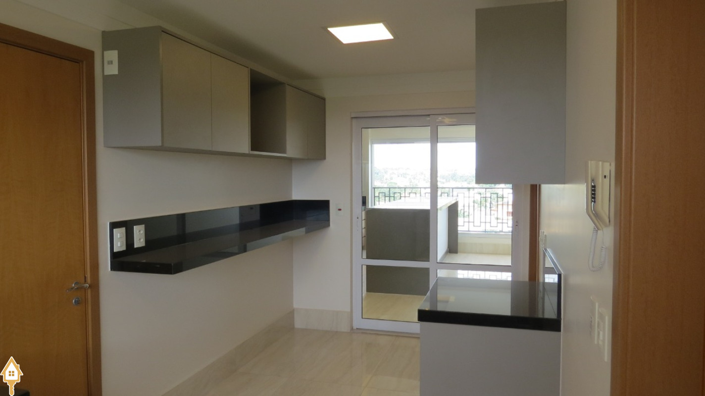 Cozinha planejada, integrada à varanda gourmet e com acesso ao elevador de serviços