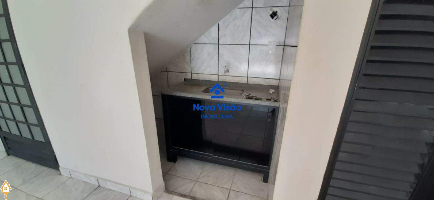 Banheiro e pia localizados na parte superior, garantindo praticidade para o dia a dia.