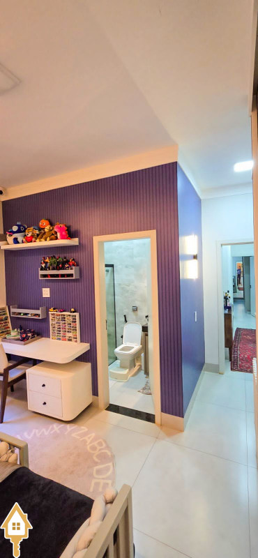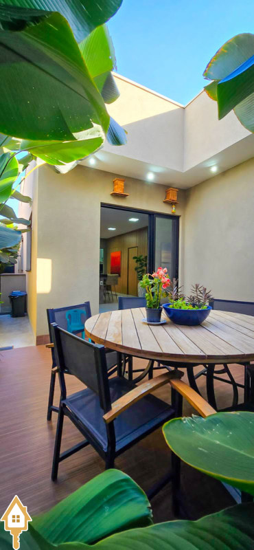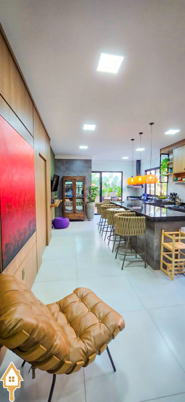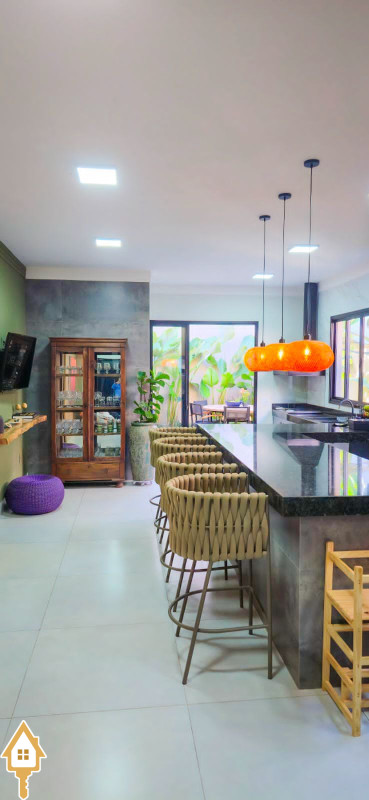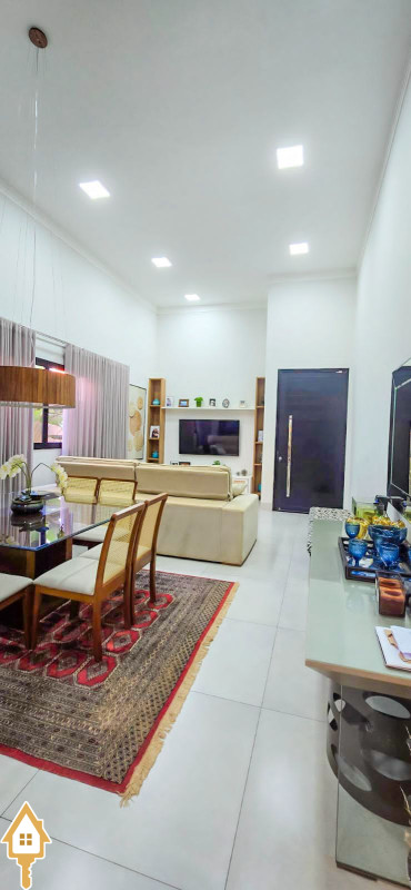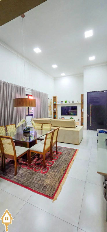 Com 180m² de área construída, esta casa possui sala com pé direito alto para 2 ambientes, já equipada com cortinas e ar condicionado.