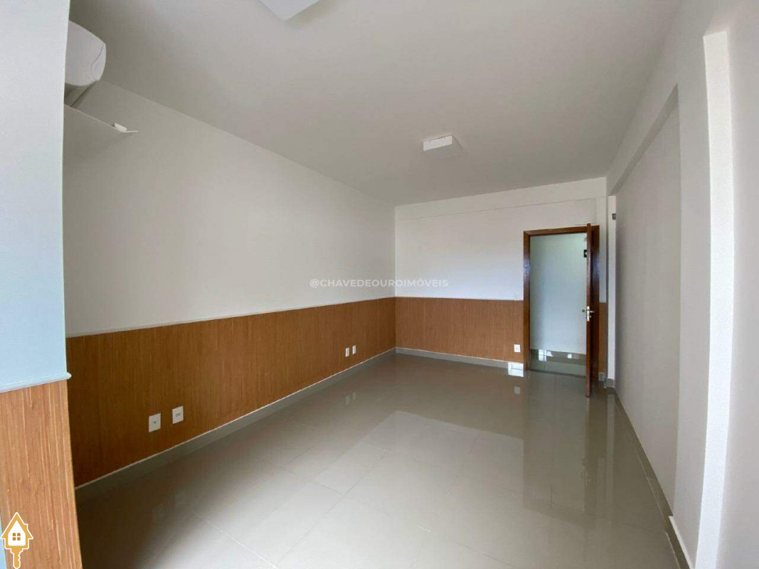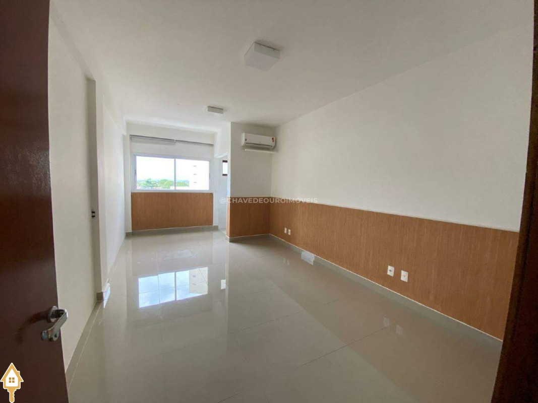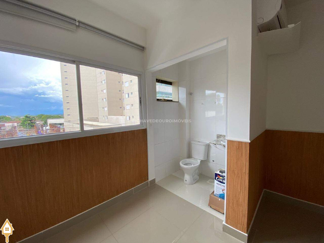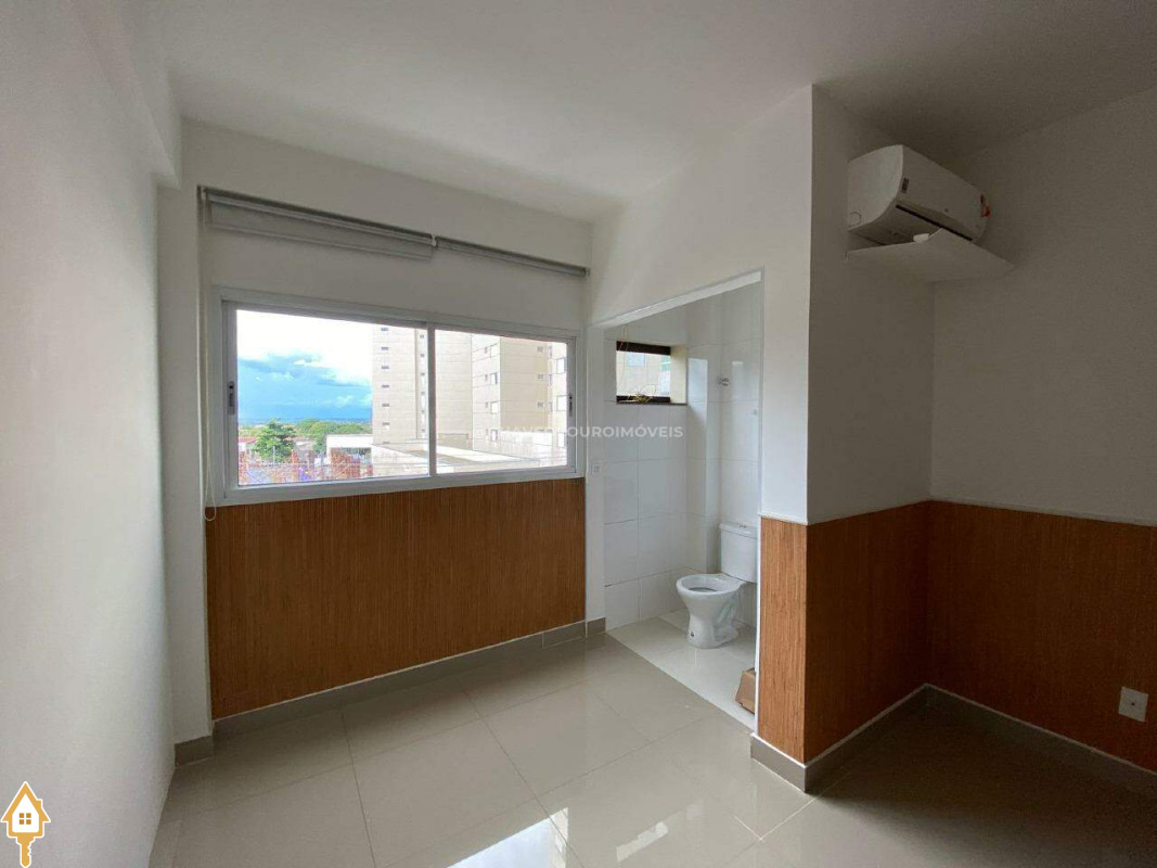 Sala com banheiro, ar condicionado instalado, persianas e uma vaga de garagem.