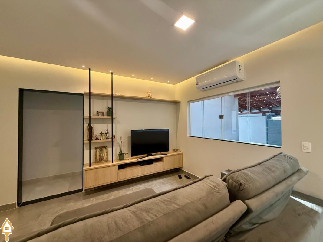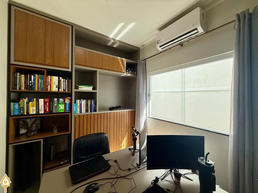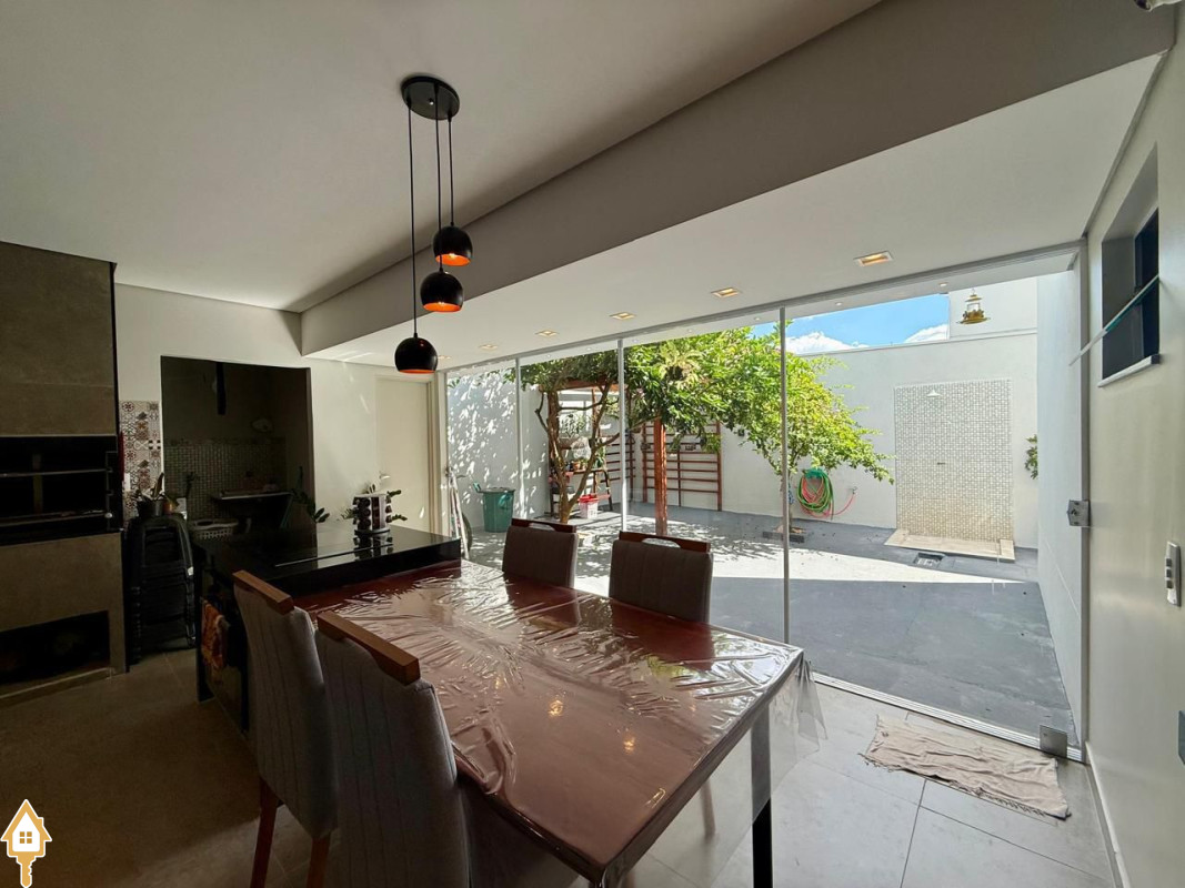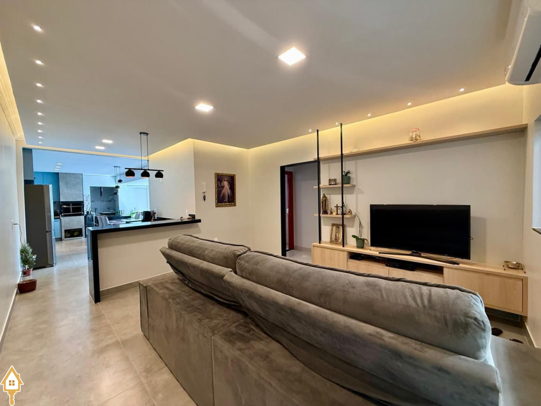 Casa à venda composta por três quartos, sendo um deles suíte, com ar-condicionado instalado em dois dos dormitórios. Conta com sala integrada à cozinha e à varanda gourmet com churrasqueira, todos os ambientes com marcenaria planejada e iluminação completa.