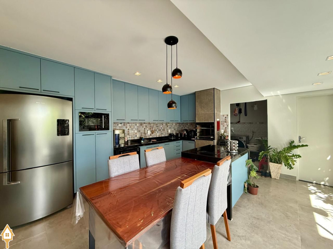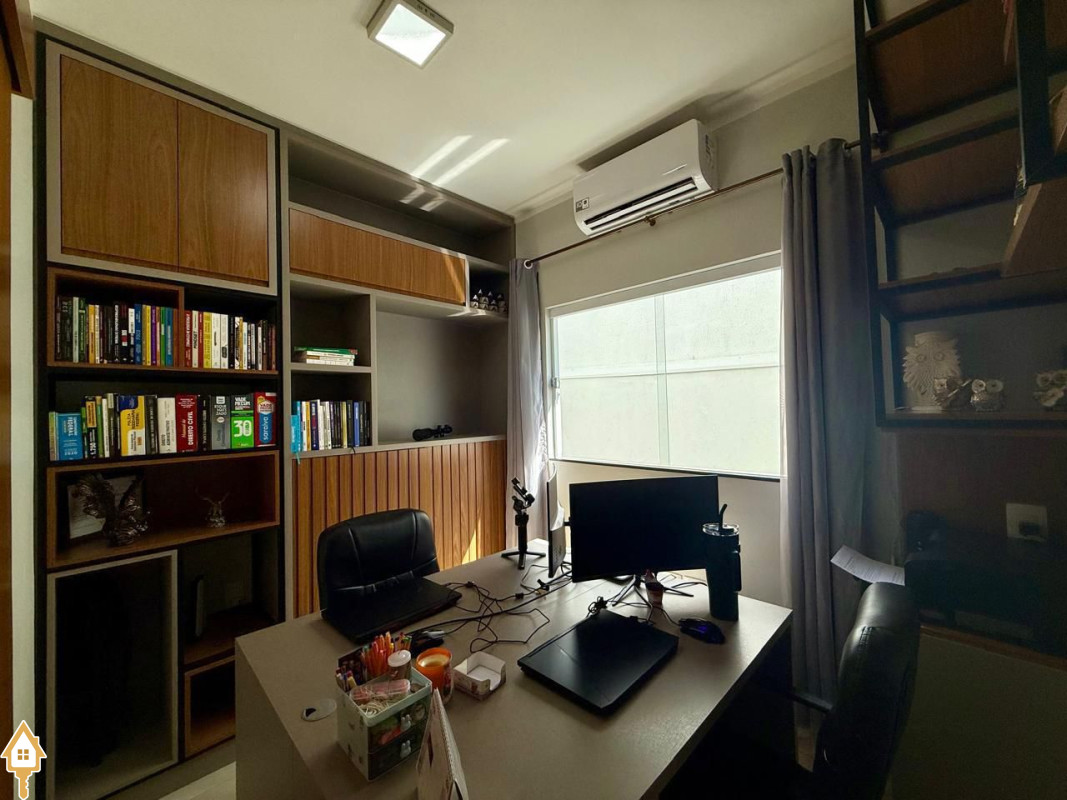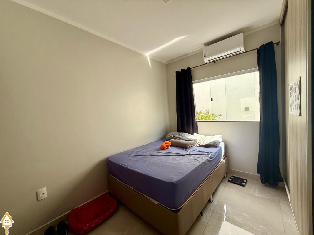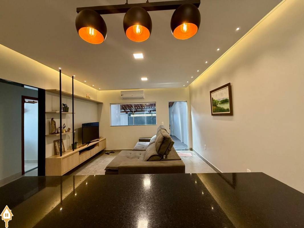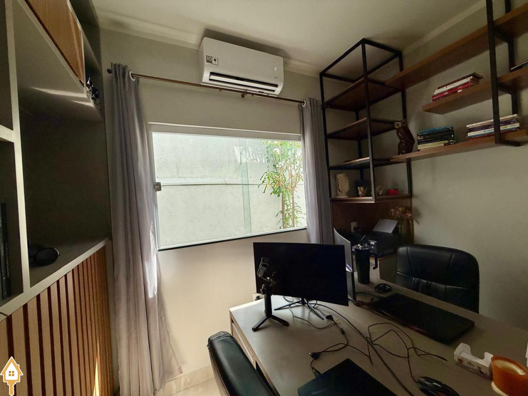 Casa à venda composta por três quartos, sendo um deles suíte, com ar-condicionado instalado em dois dos dormitórios. Conta com sala integrada à cozinha e à varanda gourmet com churrasqueira, todos os ambientes com marcenaria planejada e iluminação completa.