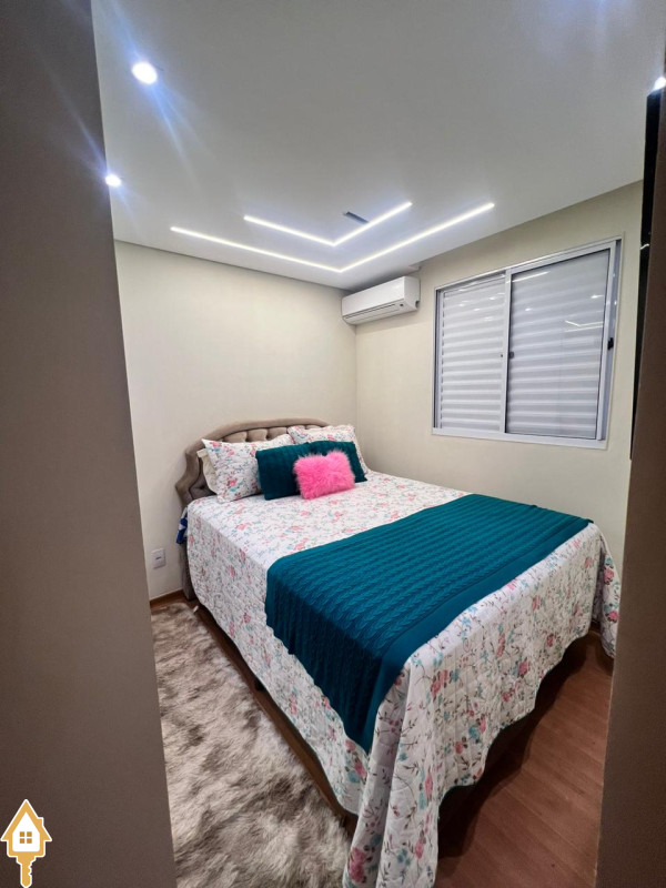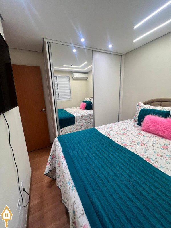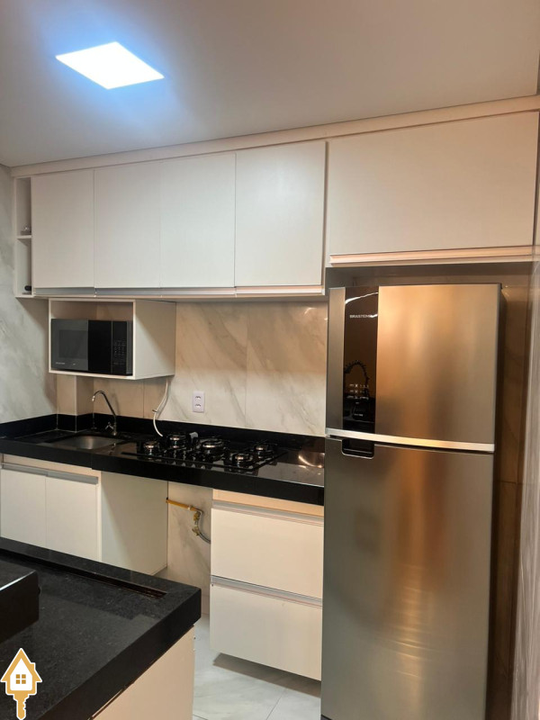 O imóvel conta com dois quartos, sala para dois ambientes, cozinha planejada e área de serviço, formando uma planta prática e confortável.