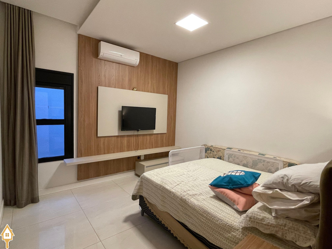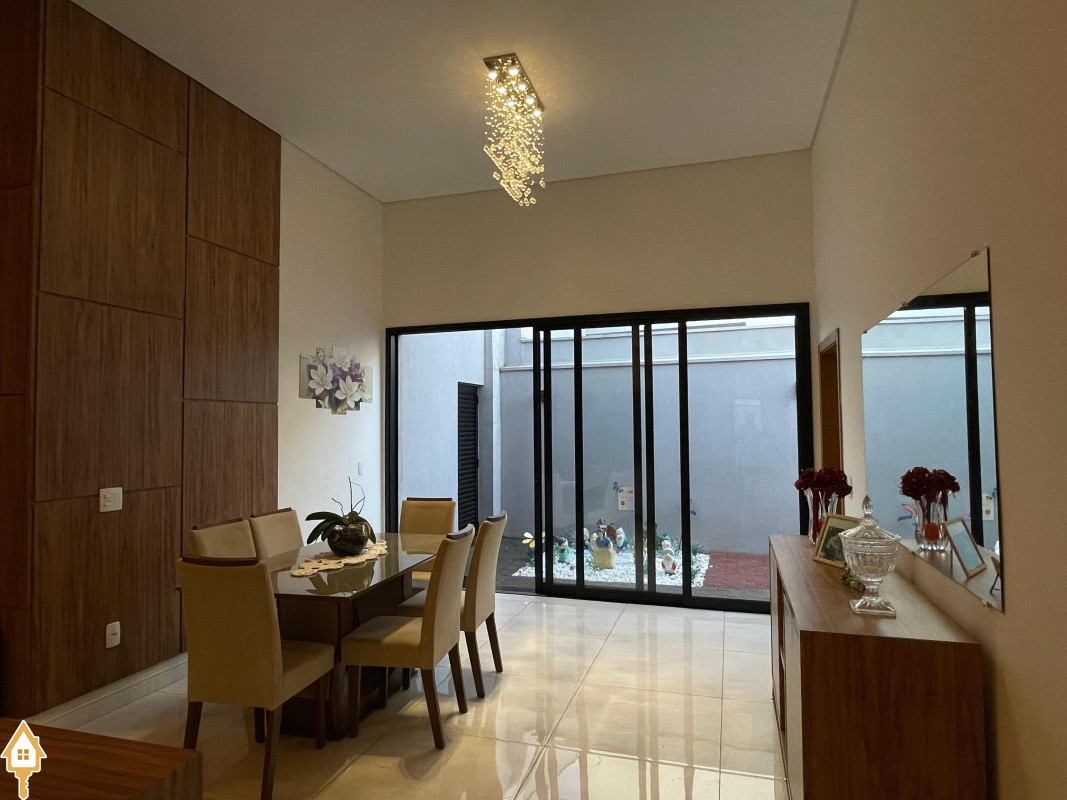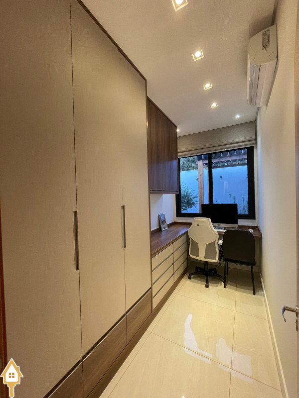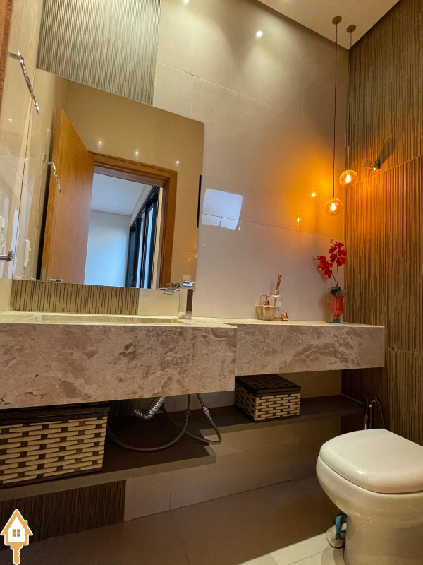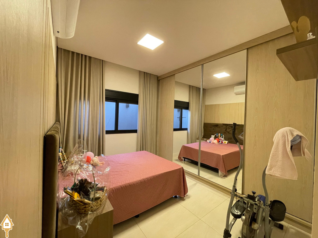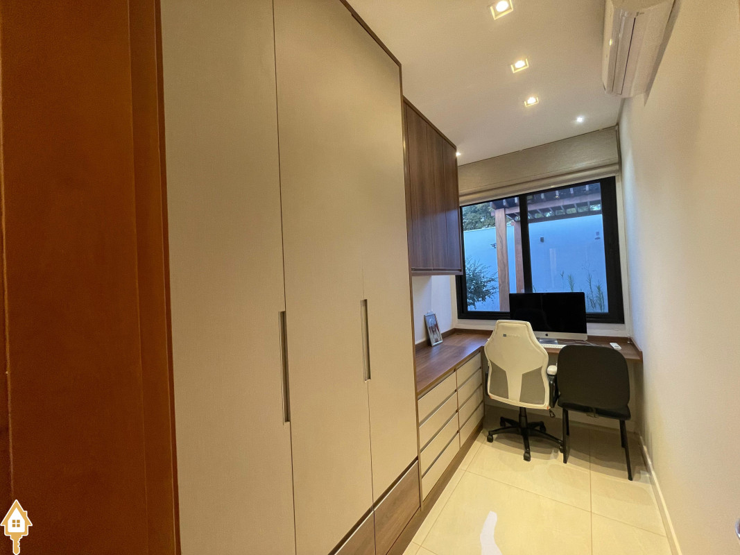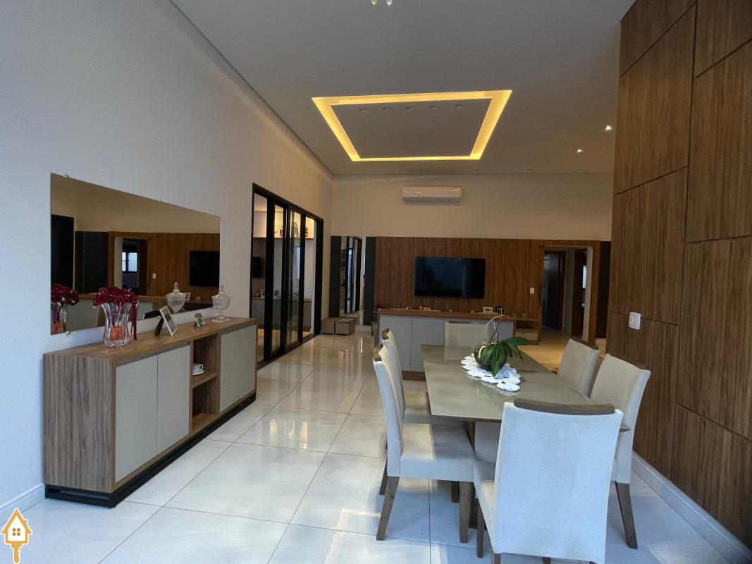 Casa térrea com 3 quartos, sendo duas suítes, a Master com espaçoso closet. Todos os quartos ricos em armários e com ar condicionado. Sala ampla 3 ambientes, com pé direito alto, toda planejada e com ar condicionado. Varanda gourmet com churrasqueira e planejados. Cozinha com cooktop, coifa, forno, rica em planejados. Escritório planejado e com ar. Lavabo decorado. Quintal amplo com banheira de hidromassagem, deck e pergolado. Sistema de irrigação. Estrutura preparada para agua quente.