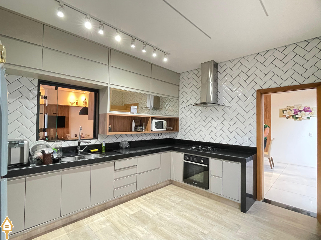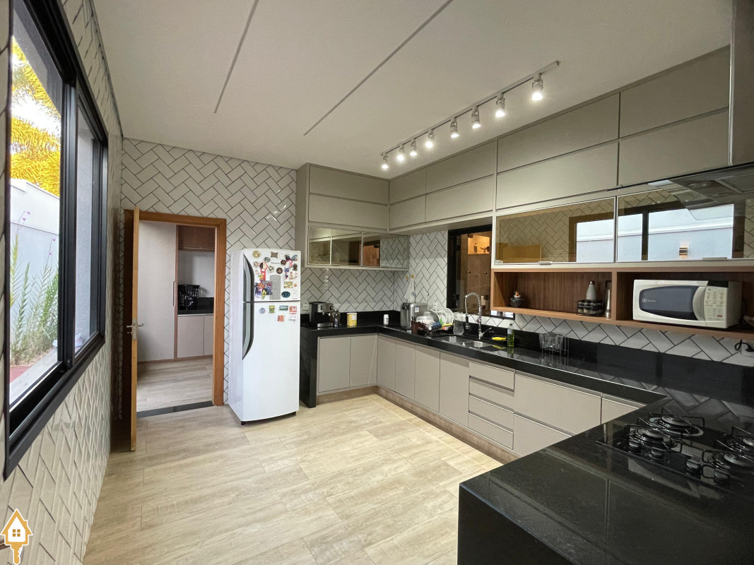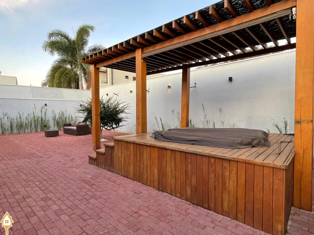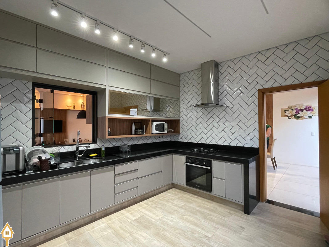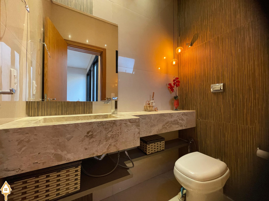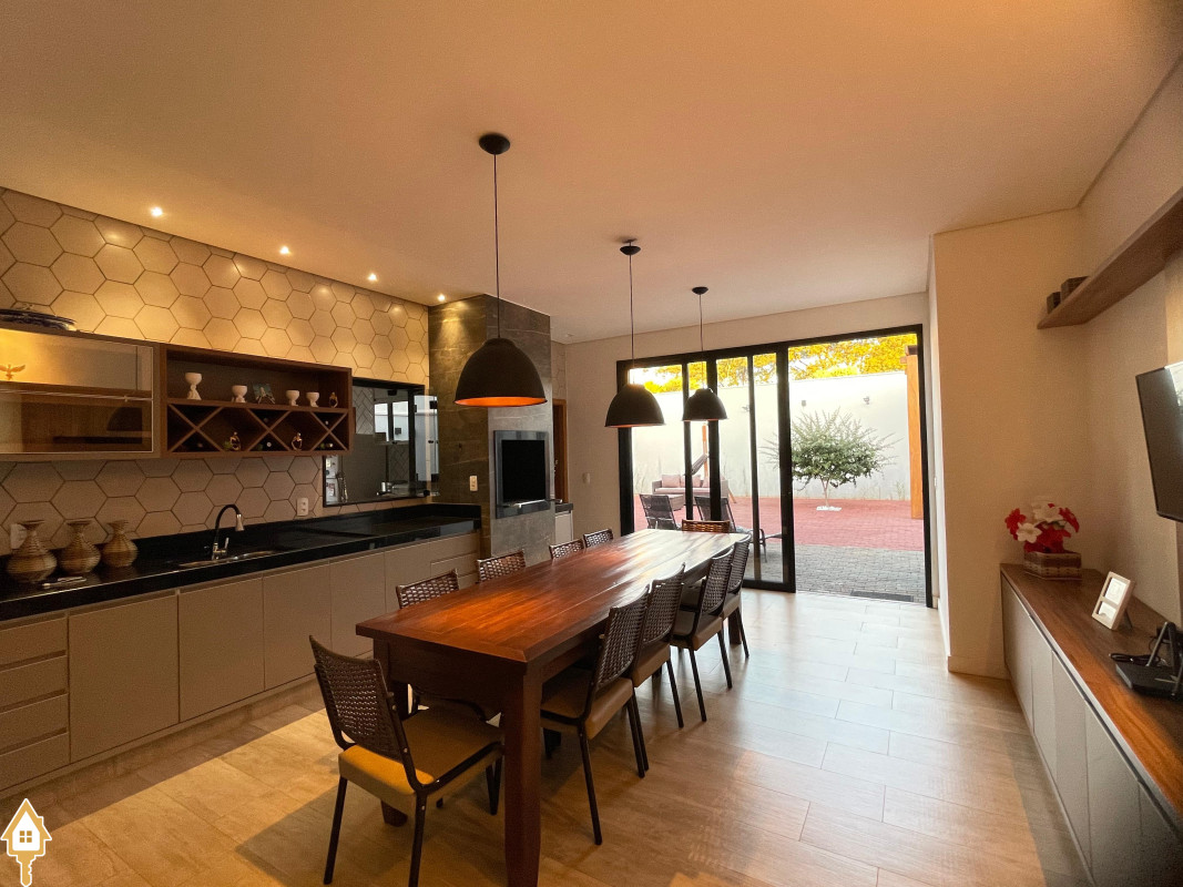 Casa térrea com 3 quartos, sendo duas suítes, a Master com espaçoso closet. Todos os quartos ricos em armários e com ar condicionado. Sala ampla 3 ambientes, com pé direito alto, toda planejada e com ar condicionado. Varanda gourmet com churrasqueira e planejados. Cozinha com cooktop, coifa, forno, rica em planejados. Escritório planejado e com ar. Lavabo decorado. Quintal amplo com banheira de hidromassagem, deck e pergolado. Sistema de irrigação. Estrutura preparada para agua quente.